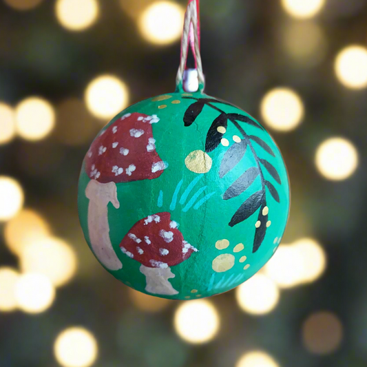 Rowan Toadstool Baubles - Green - Set of Three - Papier Mache - Hand Painted - Eco