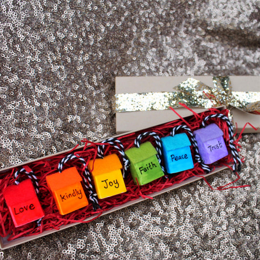 Virtue Rainbow Houses- Ceramic Miniatures - Limited Edition - Hand Painted - Hanging Ornaments