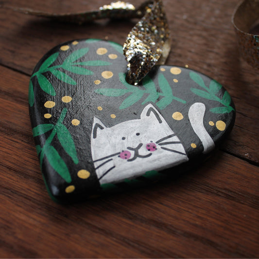 Rowan Ceramic Silver Cat Heart Decoration - Hand Painted - Cat Lovers Gift