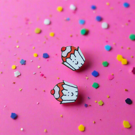 Wooden Cupcake Stud Earrings - Birch Wood - Steel - Low Allergy - Eco