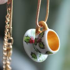 Holly Ceramic Teacup Necklace - Limited Edition - Christmas Party - Gold - Miniature