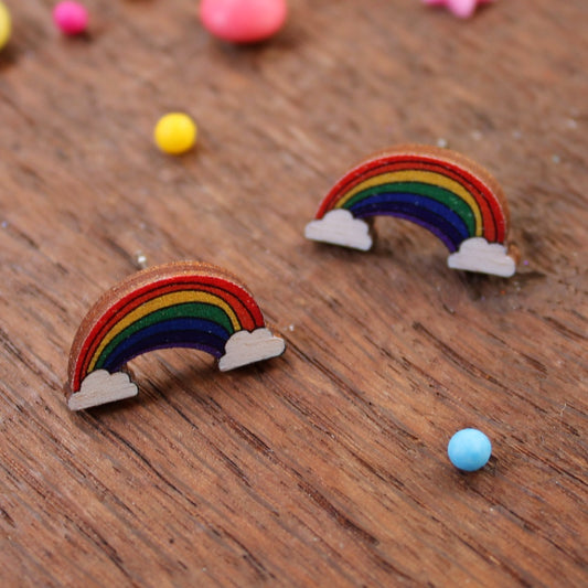 Wooden Rainbow Stud Earrings - Birch Wood -Steel - Low Allergy - Eco