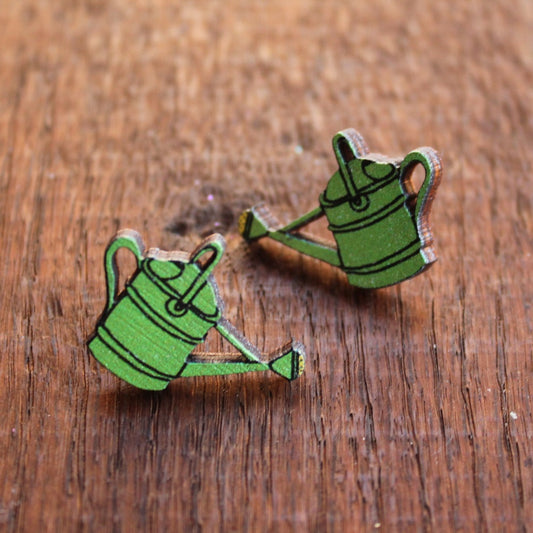 Wooden Watering Can Stud Earrings - Birch Wood - Steel - Low Allergy - Gardener's Gift - Eco